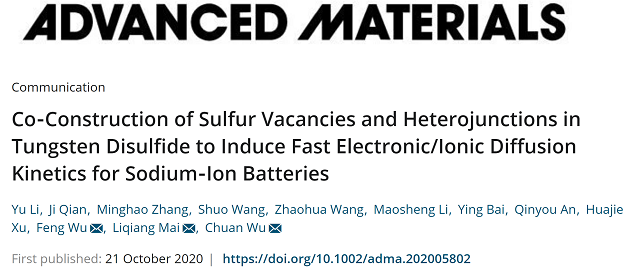 近日,澳门太阳城app材料学院吴锋院士团队在钠离子电池材料的结构设计和性能优化方面取得重要突破。材料类国际顶级期刊《Advanced Materials》(《先进材料》,影响因子27.398)以“Co-Construction of Sulfur Vacancies and Heterojunctions in Tungsten Disulfide to Induce Fast Electronic/Ionic Diffusion Kinetics for Sodium-Ion Batteries”为题在线报道了这一研究进展。该工作由吴锋院士团队的吴川教授课题组完成,太阳城app材料学院博士后李雨为第一作者,澳门太阳城app吴锋院士、吴川教授和武汉理工大学麦立强教授为共同通讯作者(文献链接:https://onlinelibrary.wiley.com/doi/10.1002/adma.202005802)。