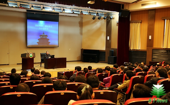 4月11日下午,“国际形势国际格局与中国外交”专题报告会在7号楼报告厅召开,中国人民大学国际关系学院副院长、对外战略研究中心主任金灿荣教授应邀来学校作报告。党委中心组成员,各学院、各职能部门的处级干部参加了报告会,报告会由杨蜀康主持。