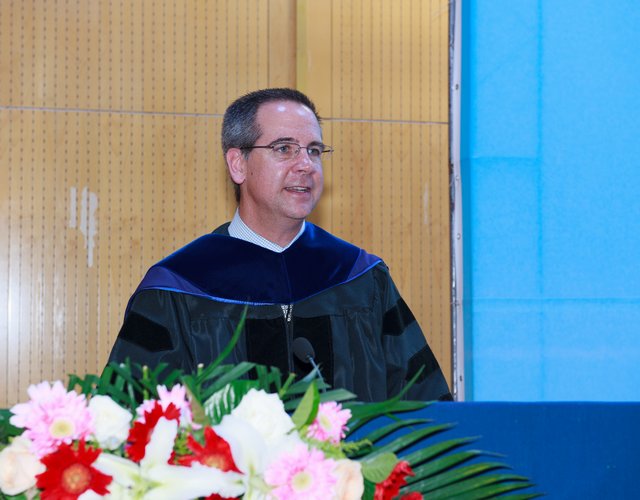 副校长孙逢春教授发表致辞,他首先向即将迈向人生新旅程的毕业生们表示热烈的祝贺,并向专程来华参加毕业典礼的犹他州立大学嘉宾们表示诚挚的欢迎。他与在座的师生们分享了自己对于“青春”与“梦想”的看法。他叮嘱同学们凡事要从小做起、从现在做起,脚踏实地、勤勤恳恳,努力用自己的双手搭建展示梦想的舞台。同学们离开校园之后,或早或晚都将融入社会的熔炉,面对充满未知的世界,他鼓励同学们只要坚持,希望就在眼前。最后,他期待同学们走出校园之后能取得更大的成功,并希望同学们能够继续关心母校的建设和发展,常回家看看。