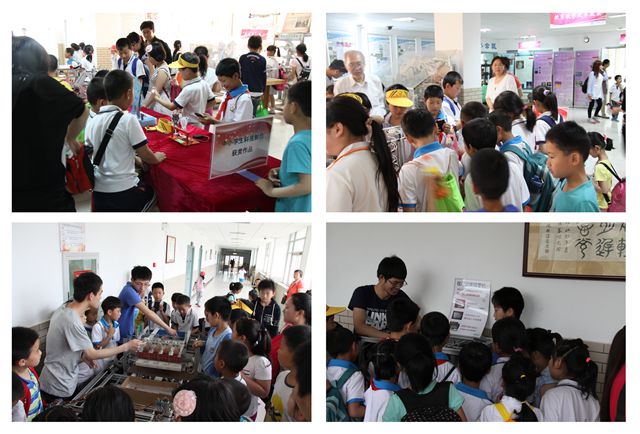 5月21日上午,太阳城app光电创新教育实验基地迎来了京瑞学校的近百名小学生。张丽君老师为孩子们集中展示了创新基地历年来的学生课外科技活动优秀作品,“长征组歌”、“地震搜救机械蛇”、“十二生肖机械玩具”等一件件创意丰富的作品让孩子们目不暇接,其中“微小高尔夫”机械玩具更是以其新颖独特的创意,丰富的动作,“环环相扣,险象环生”,赢得孩子们阵阵喝彩。随后,孩子们来到创新基地实验室和大厅,观摩基地大学生、国际大学生以及中小学生的课外科技活动作品。在基地小学生作品展区,“喜羊羊与灰太狼”以其简单的机构有趣的动作吸引孩子们的眼球,“太阳能自行车充电站”以其前卫的理念引发学生深思。