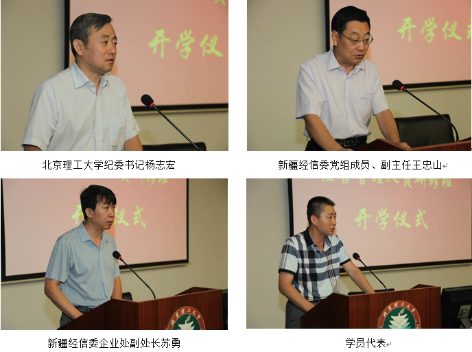 杨志宏代表学校对来自新疆信经委的领导、学员们表示了热烈的欢迎,感谢新疆经信委对我校的信任,学校将会用最优的服务、最强的师资力量,办好此次研修班。王忠山也对此次培训寄予厚望,希望学员们珍惜本次学习机会,在学习中交流提高,实现企业跨越式成长,为新疆地区的经济发展做出更大贡献。苏勇宣布了本次研修班的班委名单。新疆北方亿星科技有限公司总经理张朝明同学代表全体学员发言,表示会好好把握这次学习机会,认真听讲,吸取知识,提升自身管理能力和水平,不辜负领导的希望。