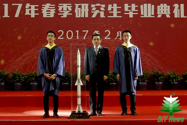 宇航学院毕业生制作了由我校研制的中国第一枚二级固体探空火箭“东方-1号”模型,献礼母校,祝愿母校续写辉煌。胡海岩代表学校接受了赠送。
