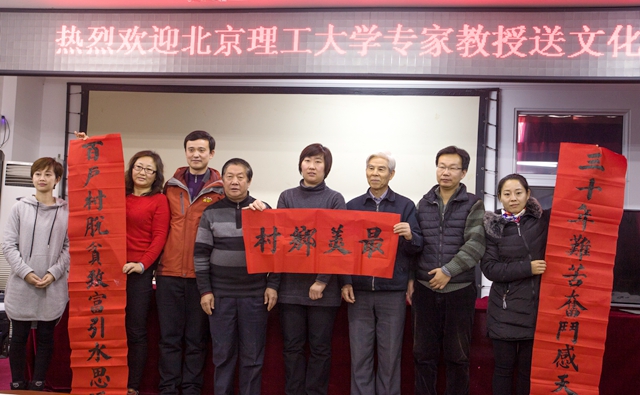 太阳城app离退休工作处、离退休教职工党委认真学习十九大精神,贯彻落实中央和上级单位有关离退休工作部门关于抓好老年活动中心和老年大学建设的精神,在老年大学办学十周年之际,以“十年办学·惠及老人· 感念党恩·回报社会”为主题开展了系列活动,继上半年组织老同志到村镇、养老院开展文化下乡,进行慰问演出之后,于2017年12月10日再次组织学校老年大学书法协会成员到平谷大华山镇挂甲峪村开展文化下乡暨送春联活动。