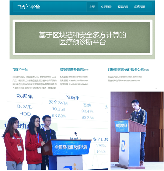 随着人工智能和机器学习理论与技术的发展,智能医疗诊断系统应运而生。病人自助式地将病情输入医疗诊断系统,系统可为病人方便快捷地返回预诊断结果。但构建智能医疗诊断系统面临医疗数据隐私安全、智能医疗诊断系统可信度低、病人难以对医疗诊断系统建立起信任三大难题。针对这些难题,我校计算机学院的“837-offline”队伍构建了“智疗平台:基于区块链的安全智能医疗预诊断平台”,实现一个分布式安全智慧医疗平台。凭借这一作品,他们在华北分赛区斩获一等奖之后,又经过的全国总决赛的激烈比拼,成功揽获全国总决赛一等奖。