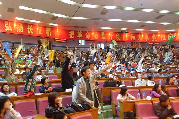 比赛现场,由44位身穿红军服的同学在观众席上摆出了红军长征路线图,一面象征长征队伍的红旗在这些“红军战士”手中一一传递,在传到一些重要地点和具有历史意义的时刻,“红军战士”为全场师生描述当时红军的情况,使师生重温了长征艰苦卓绝的历程。