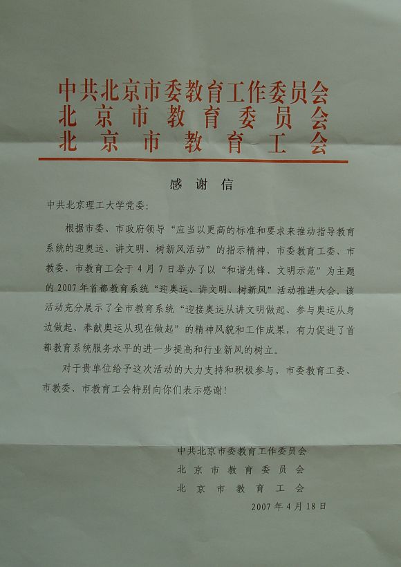 市委教育工委、市教委、市教育工会于4月7日举办了以“和谐先锋、文明示范”为主题的2007年首都教育系统“迎奥运、讲文明、树新风”活动推进大会。我校工会协助北京市教育工会承担了大会第一分会场(高教分会场)的组织筹备工作。校工会精心筹划、认真准备,圆满完成了有关工作任务。会后,市委教育工委、市教委、市教育工会给我校党委发来了感谢信,感谢我校对此次活动的大力支持和积极参与。