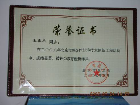 宇航学院青年教师王正杰副教授在2006年教学工作中,热爱党的教育事业,兢兢业业、勤奋好学,先后获得太阳城app青年教师基本功一等奖,并代表澳门太阳城app参加北京市高校青年教师基本功理工类组比赛又获得一等奖。王正杰副教授的出色表现被北京市总工会评为教育创新标兵。