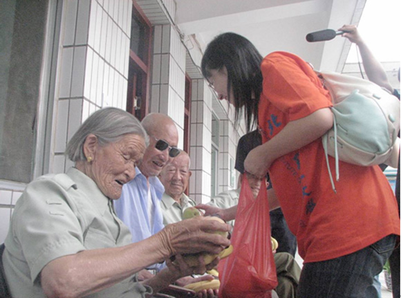 今天的最后一站——八一敬老院。这是全国唯一的一家政府出资供对革命做过突出贡献的老红军养老的敬老院。我们给老人带去了水果和牛奶等一些食品。