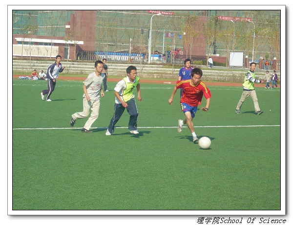 一改理学院小场足球赛的风格,我院2007级数学系同学组成数学联队,对阵我院2007级物、力、化三系联队,一声哨响,比赛开始,不一会三系联队就组织起了几次漂亮的进攻,对数学联队的城门进行狂轰乱炸,创造了好几次绝佳的进球机会,数学系的同学并不示弱,沉着冷静,不急不躁,对自家禁区严防死守,还不时来个防守反击,比赛如火如荼的进行着,终于在上半场快结束时,三系联队抓住对手后防空虚的机会,果断进攻,前锋队员在队友的助攻下,终于打破僵局,上半场就在三系联队领先一球的情况下结束了。