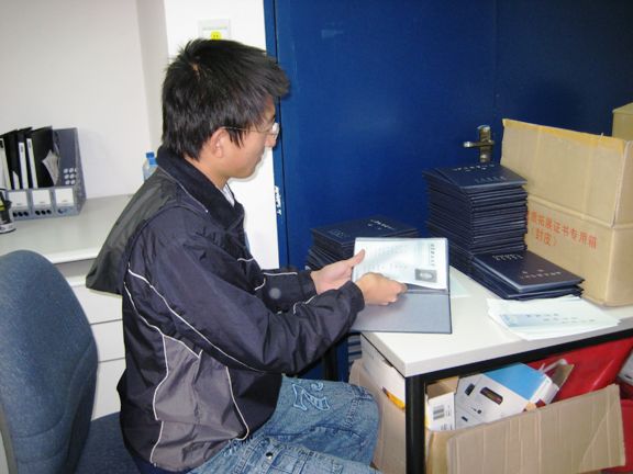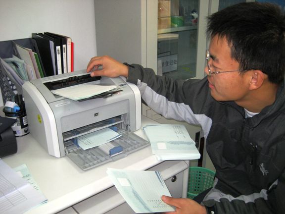 上午9:00,四位同学就来到了校素质拓展中心,紧张地开始了工作。四位同学配合有序,分工明确。审核、打印、分装,有条不紊地进行着。虽然印制过程中,出现了不少这样那样的问题,但他们及时地找到相关的负责人认真地解决。由于需要打印的份数较多,四位同学顾不上吃中饭,终于赶在下午3点左右印完了所有的证书。