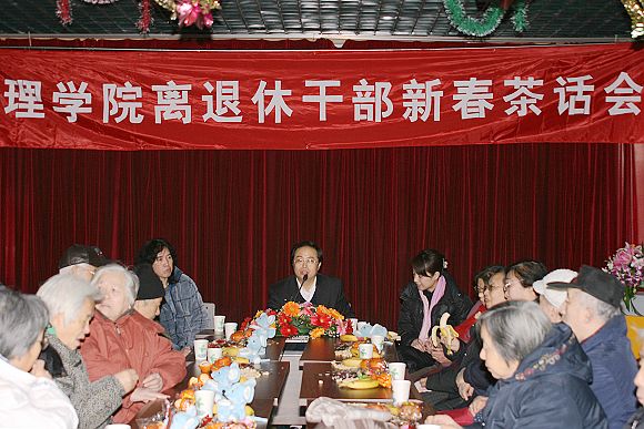 2008年1月25日上午十点,理学院在校工会多功能厅隆重举行离退休干部新春茶话会,向为理学院的建设发展作出巨大贡献的老前辈们送去新年的问候与祝福。理学院党委书记何明,党委副书记、副院长姜艳,副院长胡海云,副院长王瑞珍,物理系党支部书记王锋,化学系党支部书记黄如丹,力学系党支部书记白若阳以及一百多位理学院离退休教师济济一堂,共贺新年。