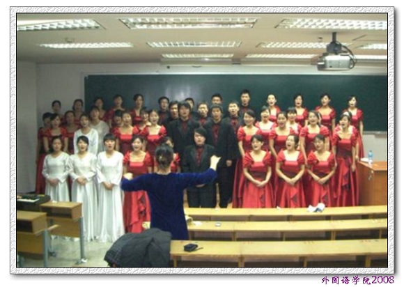 在一个月的排练过程中,很多有特长的同学纷纷崭露头角,为合唱比赛做出很大贡献。来自08级德语语言文学班的徐茜同学乐感很好,也有指挥经验,担任合唱队指挥;同班的王雪同学是八级的钢琴“高手”,担任伴奏;同是德语班的李正香同学,同英语语言文学班的李相虎同学一起,担任朗诵;外语语言学及应用语言学班的王梦同学不仅自己弹奏和录制钢琴音准帮助大家练习,而且每次排练都录制mp3, 课后发给大家,帮助大家更快地掌握每次课的内容……五十余名合唱队员心齐,劲足,方法巧,从来没有抱怨,有的是课上课下认真的学习和投入。