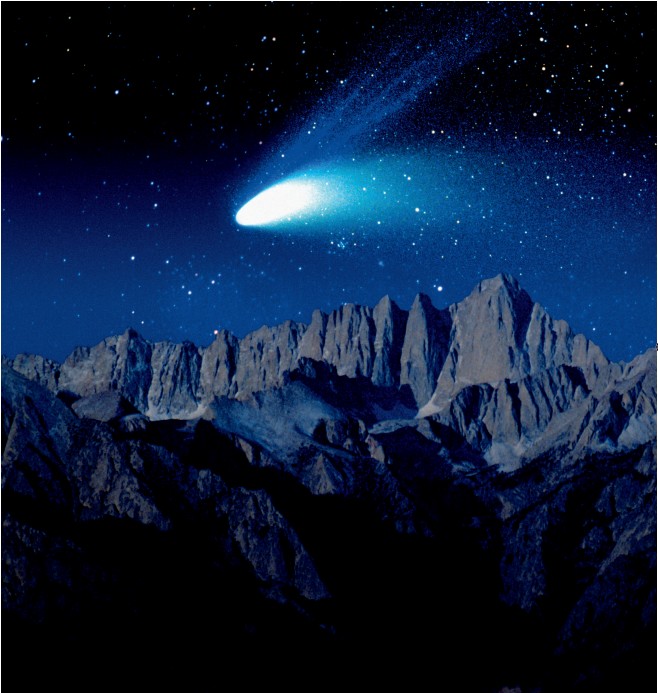 图二:1997年,在加利福尼亚州西瓦内华达山区,“海尔-波普彗星”的雾化尾迹发出明亮的光,照亮了惠特尼地区层峦叠嶂的群山。