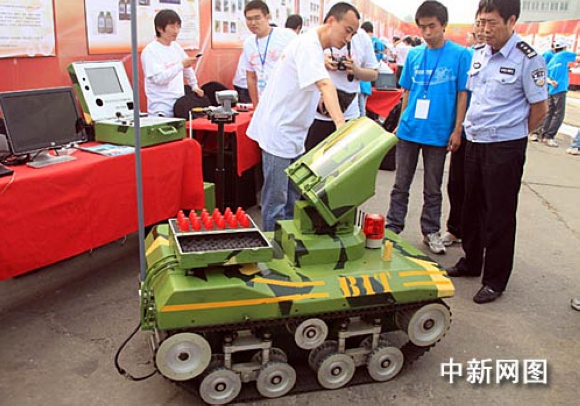 5月16日上午,2009全国科技活动周暨北京科技周开幕式在北车集团二七机车厂举行,中央政治局委员、国务委员刘延东、中国科技部万钢部长、中国科学技术协会副主席、书记处第一书记邓楠等领导出席了在北京举行的开幕式。我校机电学院本科生作品“新型多用途反恐防暴机器人”大学生创新创业成果亮相科技周。