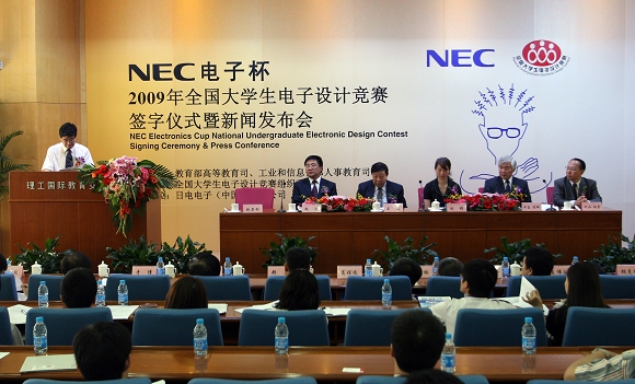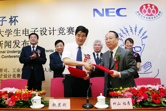 全国大学生电子设计竞赛自2009年起,将由NEC电子中国独家赞助由中国教育部高等教育司及工业和信息化部人教司主办的全国大学生电子设计竞赛,比赛正式更名为“NEC电子杯全国大学生电子设计竞赛”。会上,双方进行了签字仪式。与会媒体记者还就各自关心的问题对王越、中岛俊雄、赵显利等进行了提问和专访。