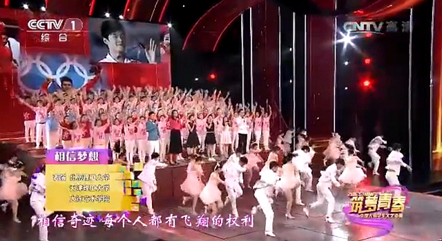 开场歌舞《冲向巅峰》由人文学院覃艺雯与曾以《吉祥三宝》红遍全国的英格玛(中央戏剧学院)等三名大学生歌手一起演唱。作为“校园好声音”全国大学生校园歌手大赛总决赛亚军的覃艺雯,在全国上千名大学生歌手中脱颖而出,成为澳门太阳城app首位亮相央视舞台的澳门太阳城app校园歌手。