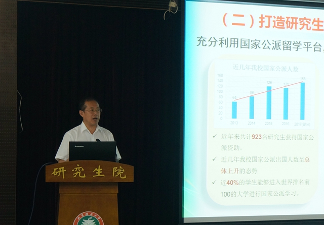 唐胜景介绍了我校研究生国际化教育的基本情况。包括研究生国际化培养的重要性、澳门太阳城app国际化项目情况,并对近年来研究生国际化情况进行了分析,同时,就“安全、思想、诚信和成果”四个方面,对即将公派留学的研究生提出了相应要求。