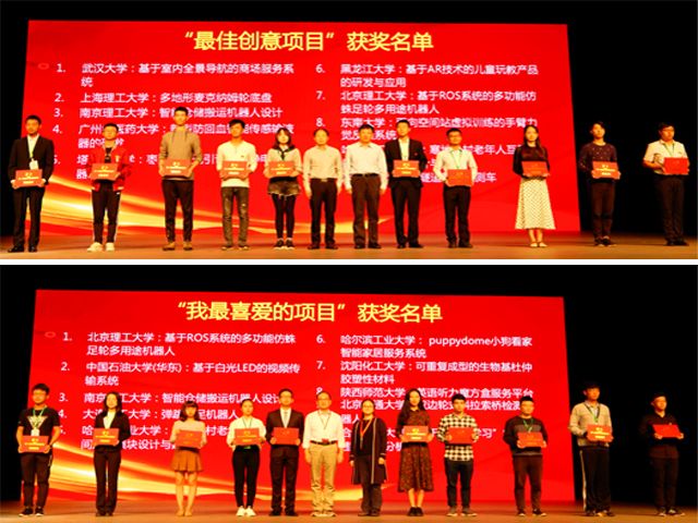 经过层层评审,我校共有2个创新训练项目和1篇学术论文从全国313所高校推荐的833个创新创业成果中脱颖而出,获准参加现场展示,经过专家现场评分和参赛选手互评等环节对255所高校的394个成果进行评价,经过激烈角逐,最终我校“基于ROS系统的仿蛛足轮多用途机器人”项目荣获“最佳创意项目”和“我最喜爱的项目”两项奖项,并在“我最喜爱的项目”评比中排名第一。